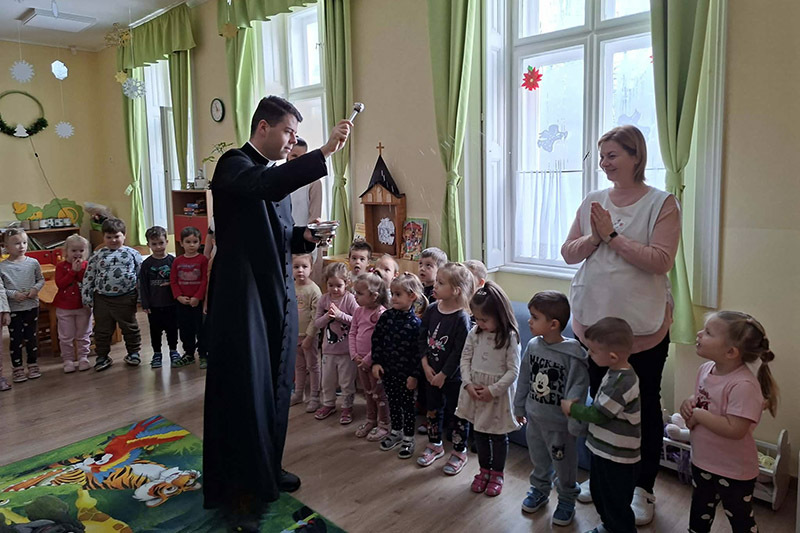 Marcsi néni hittant tartott minden óvodásunk számára Vízkereszt alkalmából. Ezt követően Tapodi Krisztián káplán atya megszentelte óvodánkat