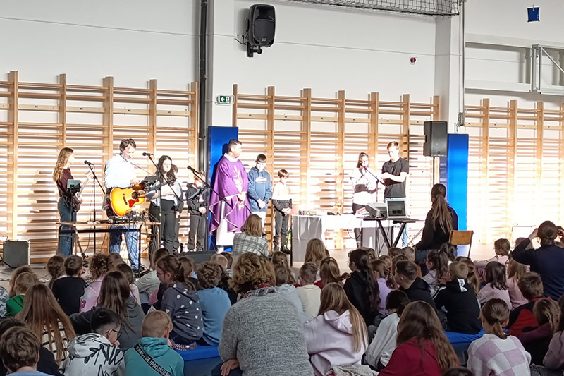 Idei lelki napunkon Csiszér László és zenekara zenélt és tett tanúságot. Az alkalmon a legkisebbektől a végzősökig részt vettek a sportcsarnokban.